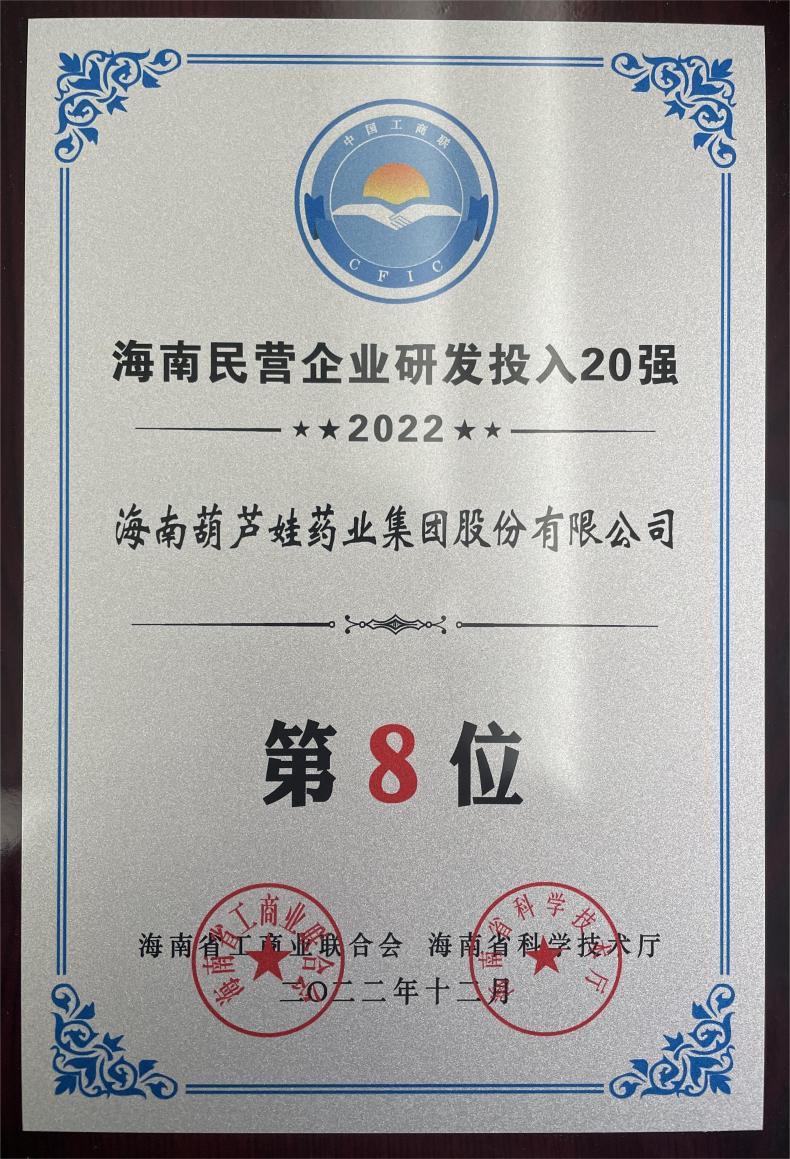 12月23日,2022海南民营企业50强和研发投入20强发布会在海口举行。会上发布了“2022海南民营企业50强”“2022海南民营企业研发投入20强”榜单和分析报告。美狮贵宾会药业再次荣登两榜,在海南民营企业50强榜单中位列第25位,较去年上升8位,这也是公司连续三年登榜;在海南民营企业研发投入20强中位列第8位,较去年上升7位。